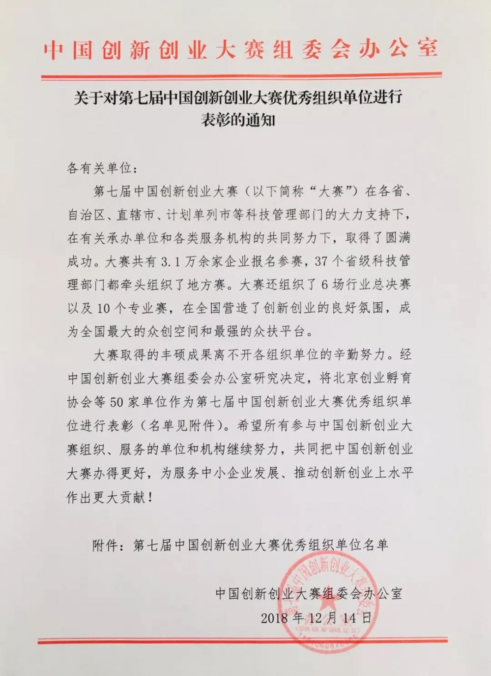 12月14日,集團(tuán)被中國(guó)創(chuàng)新創(chuàng)業(yè)大賽組委會(huì)授予“第七屆中國(guó)創(chuàng)新創(chuàng)業(yè)大賽優(yōu)秀組織單位”。