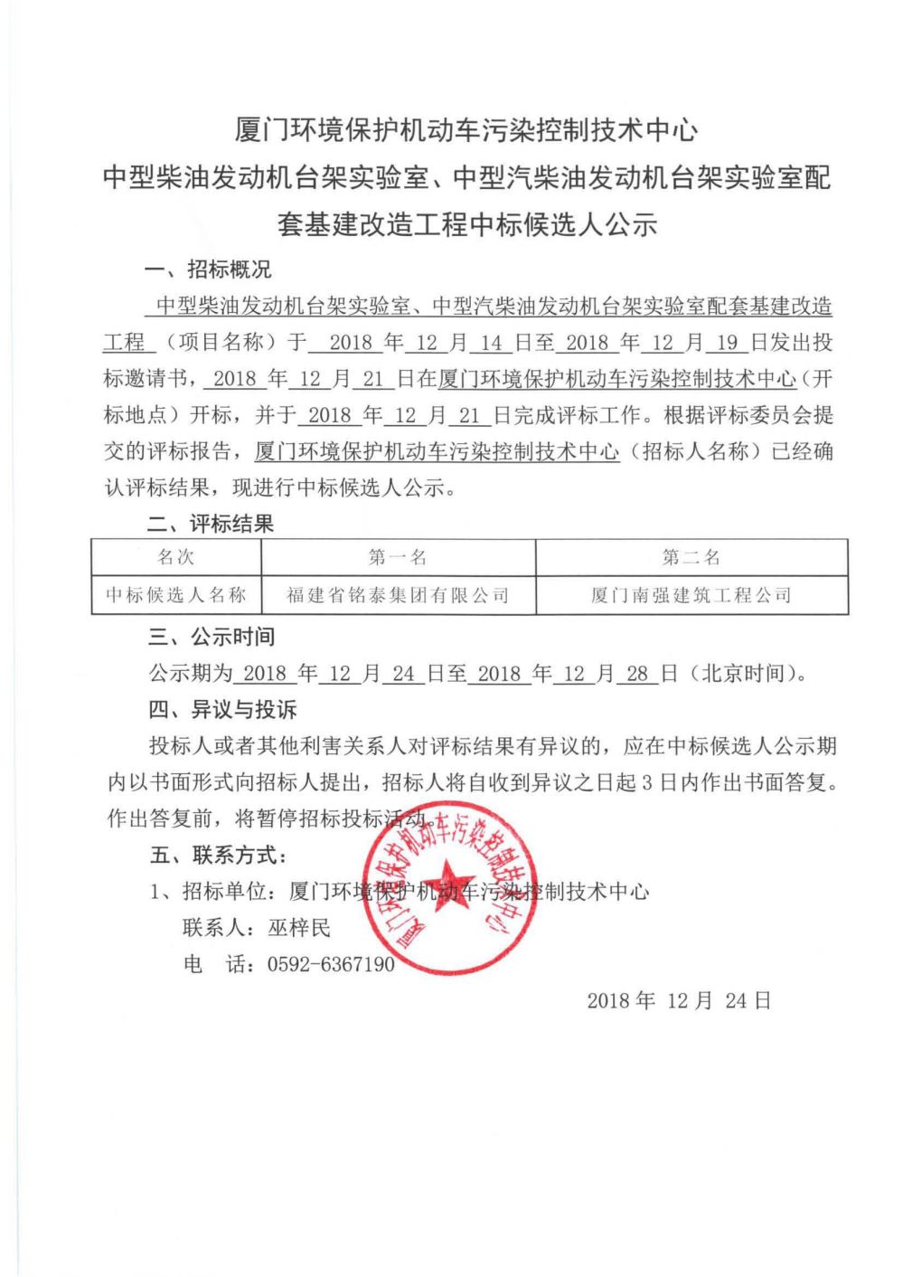 廈門環(huán)境保護(hù)機(jī)動(dòng)車污染控制技術(shù)中心中型柴油發(fā)動(dòng)機(jī)臺(tái)架實(shí)驗(yàn)室、中型汽柴油發(fā)動(dòng)機(jī)臺(tái)架實(shí)驗(yàn)室配套基建改造工程中標(biāo)候選人公示