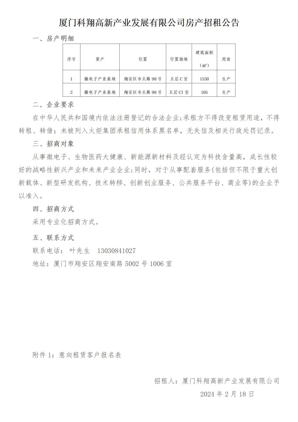 廈門科翔高新產(chǎn)業(yè)發(fā)展有限公司房產(chǎn)招租公告 欄目:通知公告 來源:廈門科技產(chǎn)業(yè)化集團(tuán) 時(shí)間:2024-02-19 熱度:153