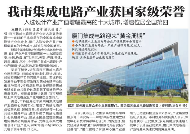 在全國(guó)集成電路設(shè)計(jì)產(chǎn)業(yè)年會(huì)上,廈門入選設(shè)計(jì)產(chǎn)業(yè)增幅最高的十大城市,增速位居全國(guó)第四。