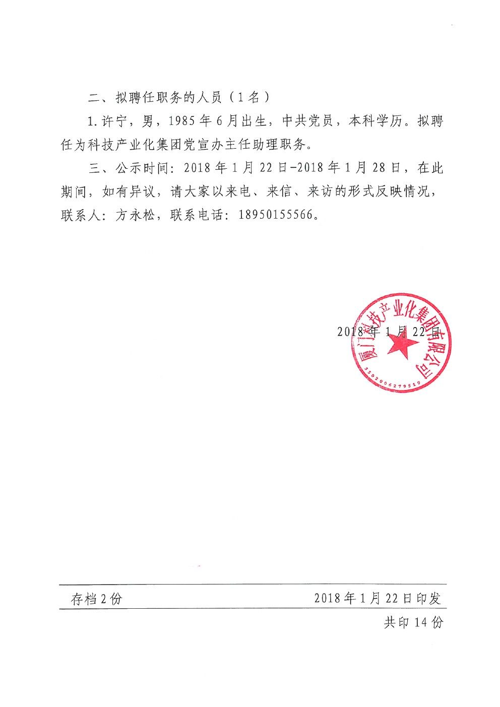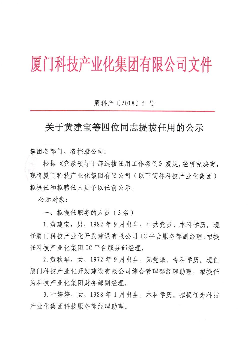 關(guān)于黃建寶等四位同志提拔任用的公示 欄目:通知公告 來(lái)源:廈門科技產(chǎn)業(yè)化集團(tuán) 時(shí)間:2018-01-25 熱度:284 關(guān)于黃建寶等四位同志提拔任用的公示.pdf